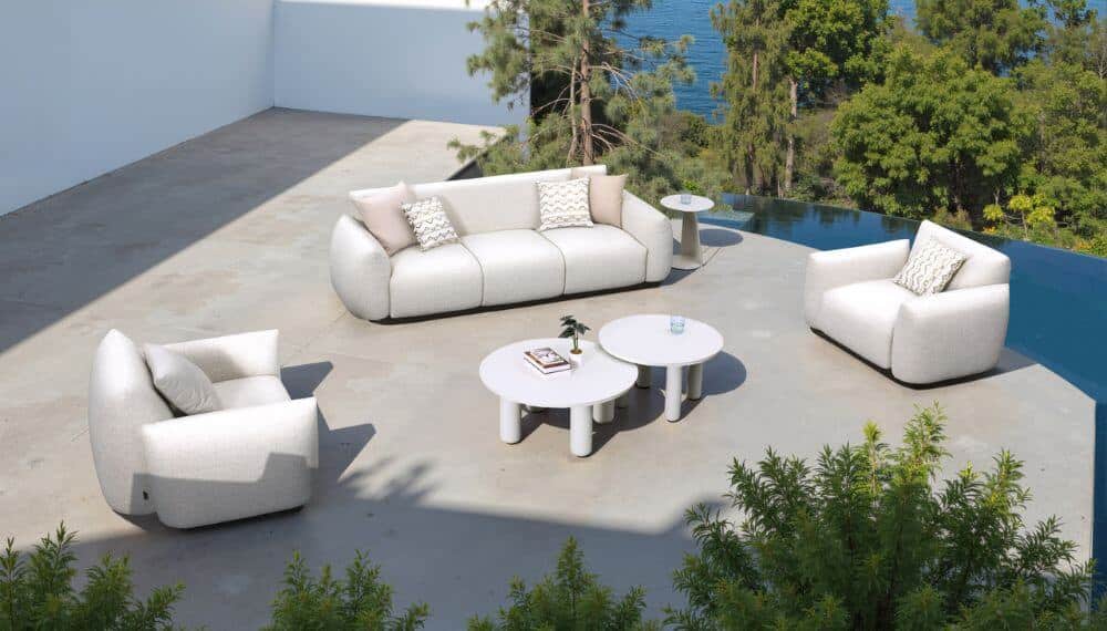 La experiencia se completa armoniosamente con un conjunto de elegantes mesas minimalistas en un brillante acabado de aluminio blanco. Sus versátiles tamaños son perfectos para colocar bebidas, aperitivos o elementos decorativos, añadiendo un toque fresco y contemporáneo que realza la sensación de luz y amplitud. El diseño coordinado garantiza una estética cuidada y sofisticada desde el primer día.